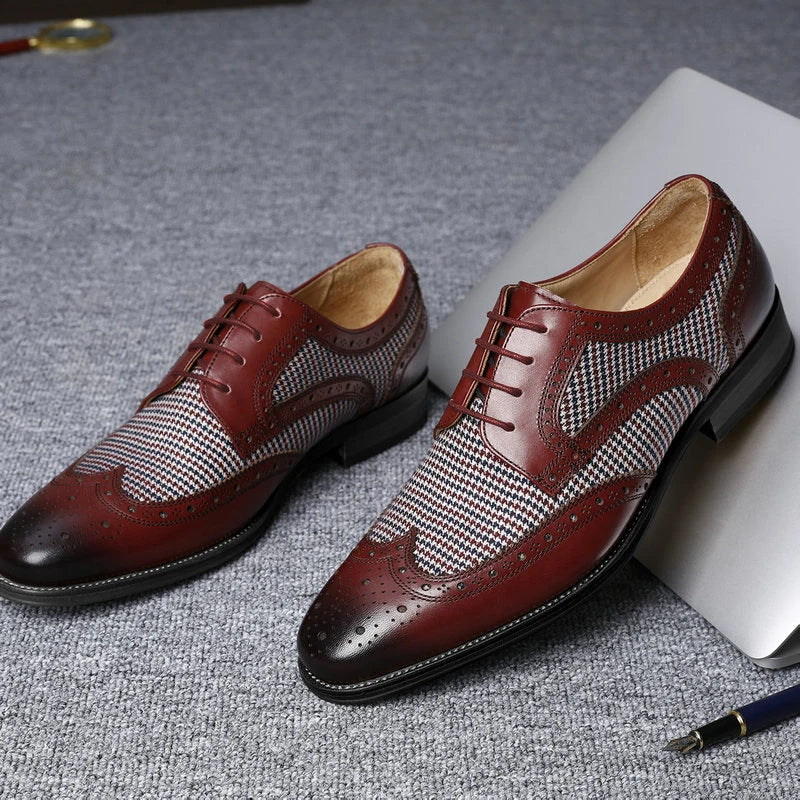 The Windsor Classic features a sleek wingtip design and available in warm brown or deep burgundy hues. The rich leather, adorned with traditional brogue detailing, is expertly paired with a refined houndstooth-patterned fabric, offering a subtle yet striking contrast.