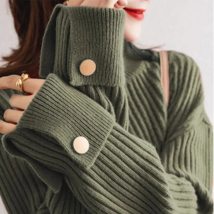 Soft. Stylish. Irresistible. This sweater wraps you in the perfect blend of comfort and high fashion. From the rich ribbed texture to the oversized cuffs with statement buttons, every detail oozes elegance. Whether you’re curled up at home or stepping out in style, this is the ultimate cozy-chic essential